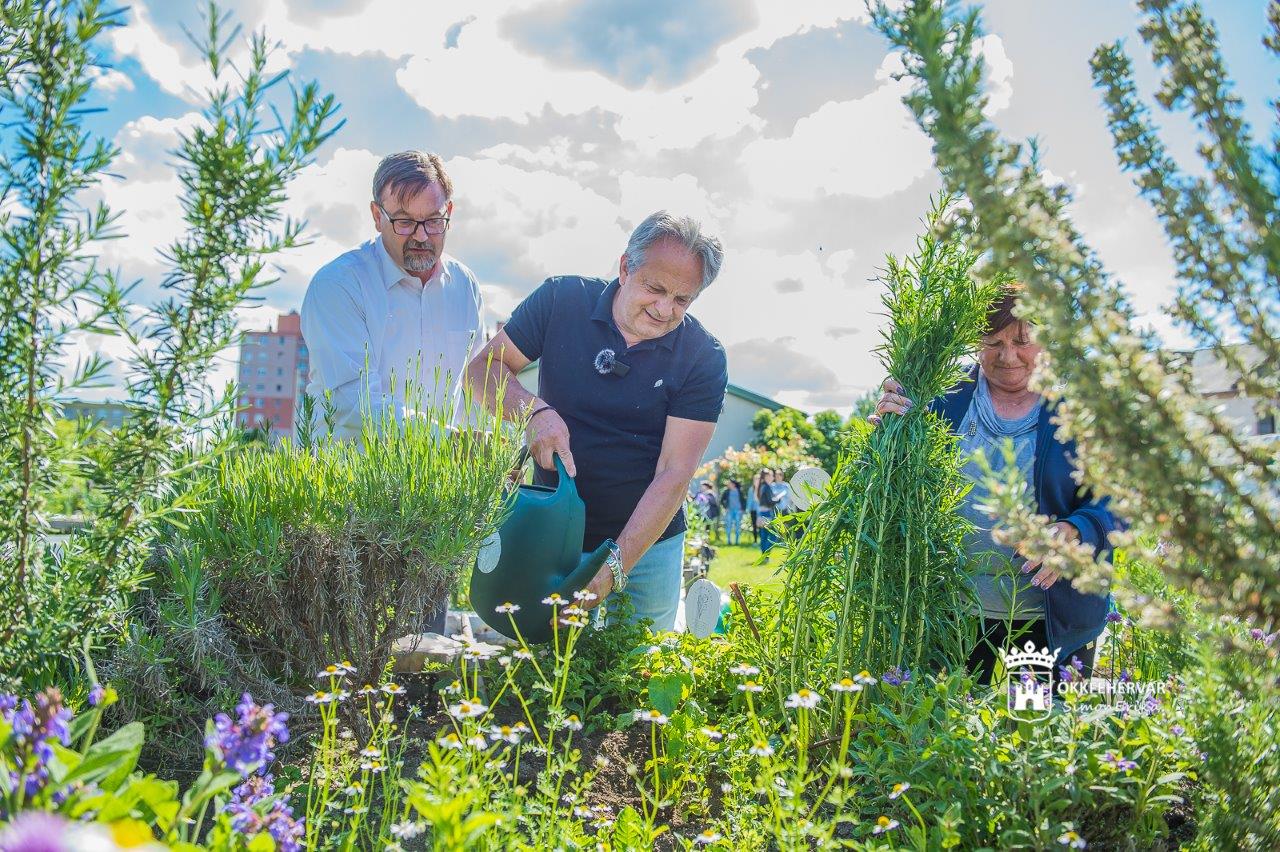 A közösségi kertbe ellátogatott Vargha Tamás, Székesfehérvár országgyűlési képviselője is, aki fűszernövény és egynyári virágpalántákat hozott magával, hogy a palotavárosiakkal közösen ültessék el.